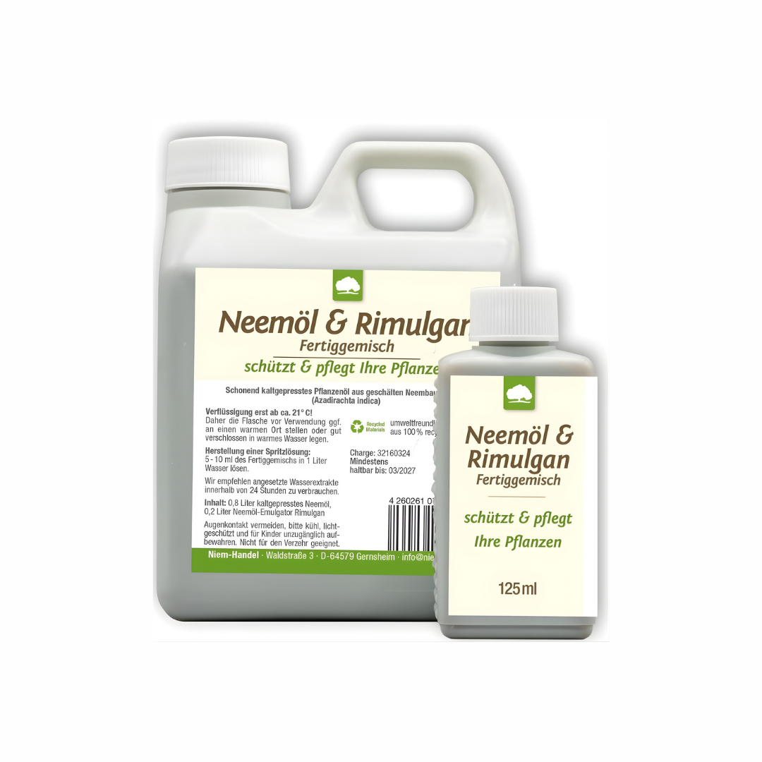 Dieses Neemöl ist bereits mit Rimulgan vorgemischt und sofort einsatzbereit. Gib einfach 5 ml auf 1 Liter Wasser, mische gut durch und sprühe die Lösung gleichmäßig auf Blattober- und -unterseiten – am besten in den Abendstunden oder bei gedämpftem Licht. Wiederhole die Anwendung alle 7–10 Tage für optimalen Schutz gegen Schädlinge und Pilzbefall.